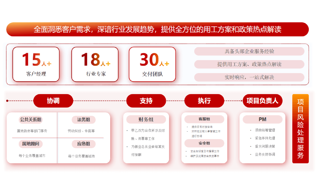 团队凭借丰富的实战经验,深刻理解客户需求,精准把握行业趋势。为头部企业提供全方位服务,解读用工政策热点。实时响应,一站式解决客户问题,确保服务高效无忧。